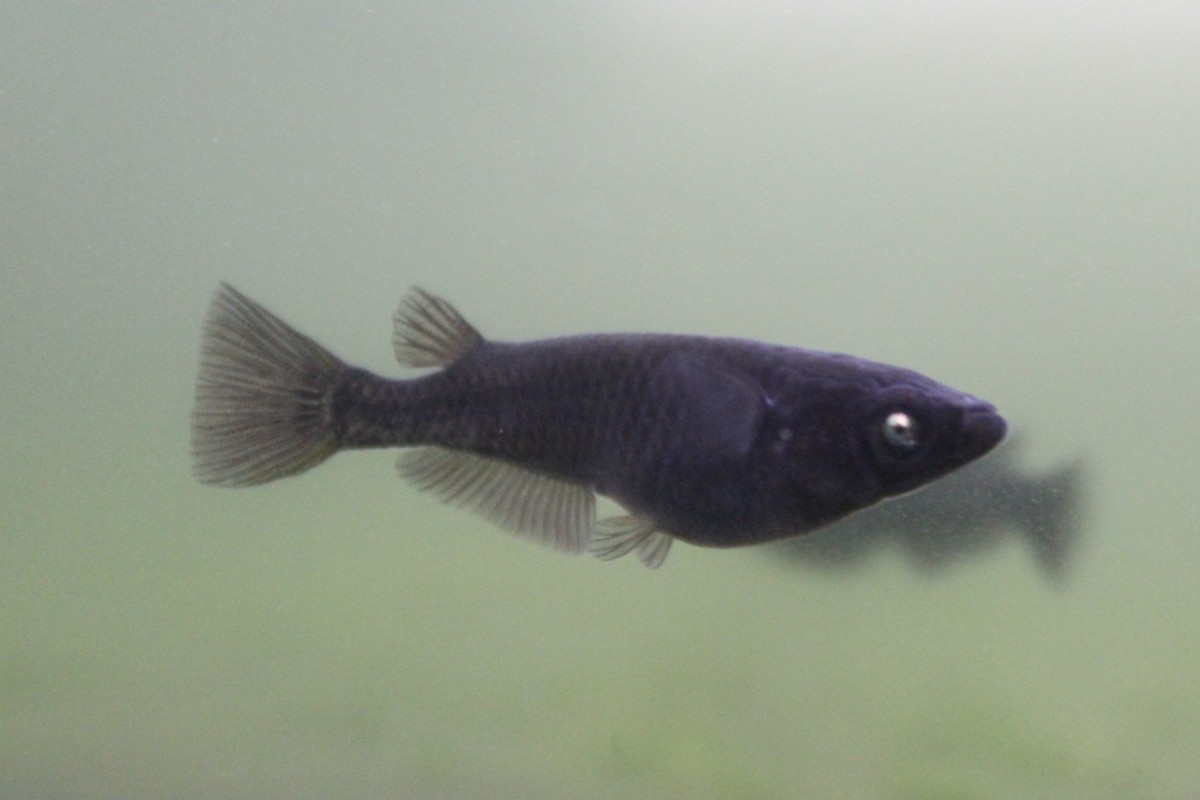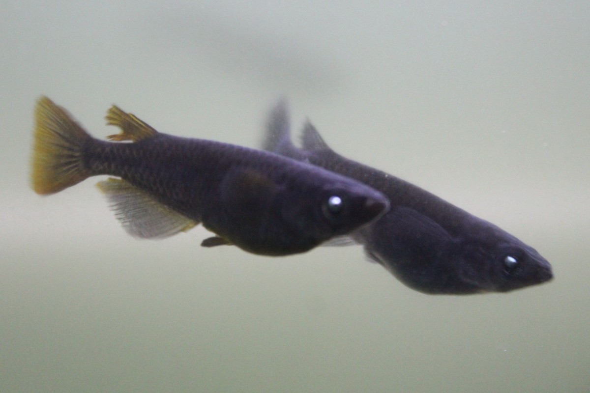 真っ黒の体色にキラッと光る眼が特徴のメダカです。
